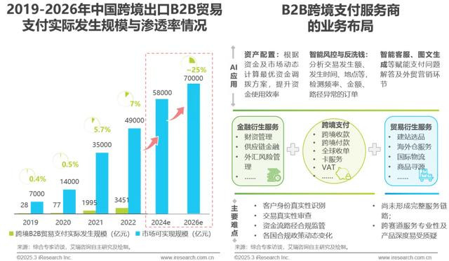 渗透情况:随着数字化深入,近年跨境支付工具在外贸B2B中应用逐渐提升,但整体渗透率仍然较低。
