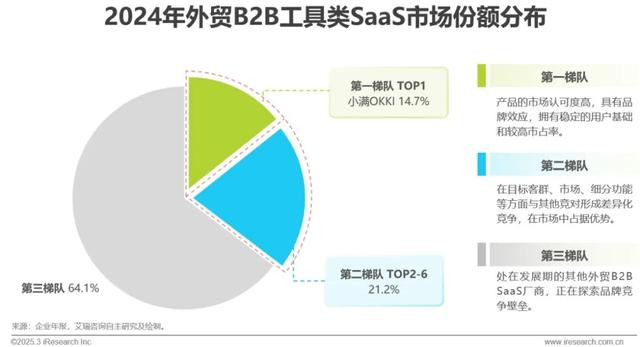 市场格局:整体上看,可将外贸B2B工具类SaaS市场按照厂商市场规模及业务成熟度划分为三个梯队,其中小满OKKI以成熟的产品形态、稳定的订阅收入及客户口碑位列第一梯队,市场份额约14.7%。