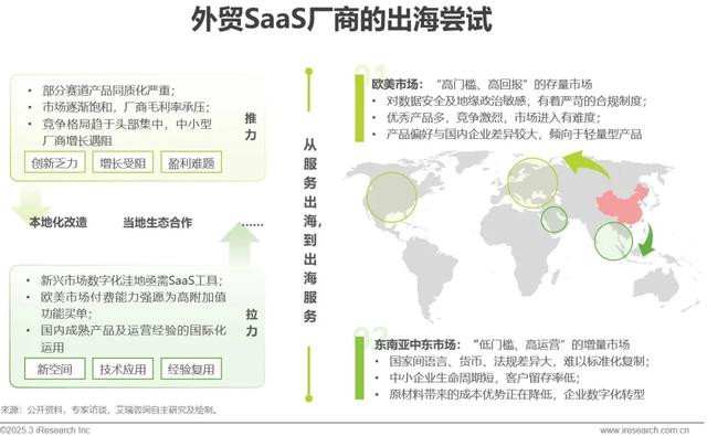 出海路径:资源有限的腰尾部SaaS厂商优先关注东南亚、中东、拉美等市场,用户数字化程度较低,产品使用习惯与国内外贸企业有一定相似性,市场进入难度相对更低。技术实力强的头部厂商适合瞄准欧美中大型客户,在垂直场景打造标杆案例。