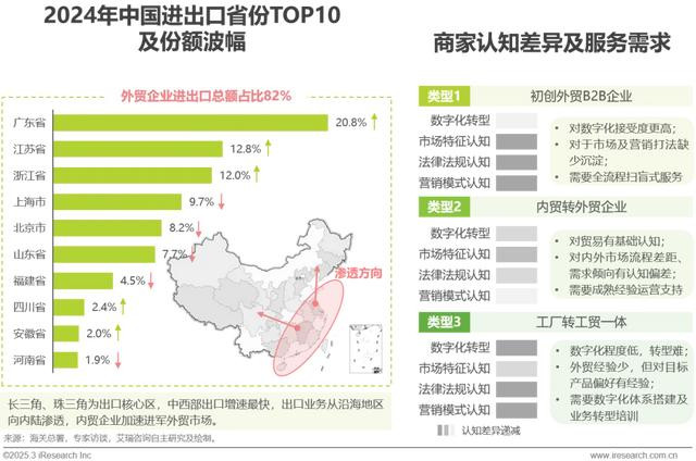 服务需求:初创企业对数字化接受度高,但对外贸流程、营销策略及市场需求或存在盲点,需要陪伴式服务辅助扫盲;内贸转型外贸的企业对外贸流程及业务模式更为熟悉,但容易陷入内外贸差异误区,需要专业运营指导;工厂转贸易的企业则面临更大转型壁垒,外贸业务模式搭建及数字化体系建设均需要专业服务支撑。