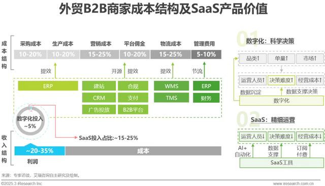 外贸企业精细化运营提上议程:为灵活应对市场环境变化、提升创收与抗风险能力,部分外贸B2B商家愿意将净利润的3-5%投入数字化建设中,其中有15-25%用于SaaS工具的采购。