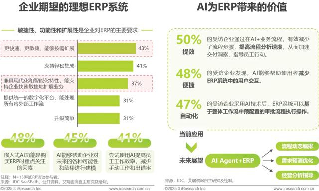 AI+ERP:近年来AI与ERP的融合,不再局限于数据监测、报表生成等基础提效功能上,更多地是利用AI的自我优化能力,结合企业内部运营数据与外部市场环境分析,以AI Agent的形态自动化帮助企业管理业务、提供决策建议,实现效率跃升、决策优化、成本控制及创新赋能。未来,AI将成为ERP系统的“智能中枢”,助力企业在复杂市场环境中保持竞争优势。