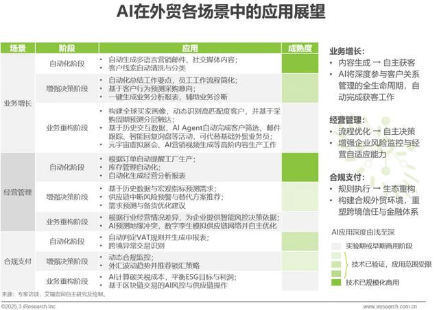 AI价值挖掘:AI在外贸SaaS各场景中的应用大多处于增强决策阶段并朝着业务重构方向发展,逐步成为外贸企业“决策大脑”。