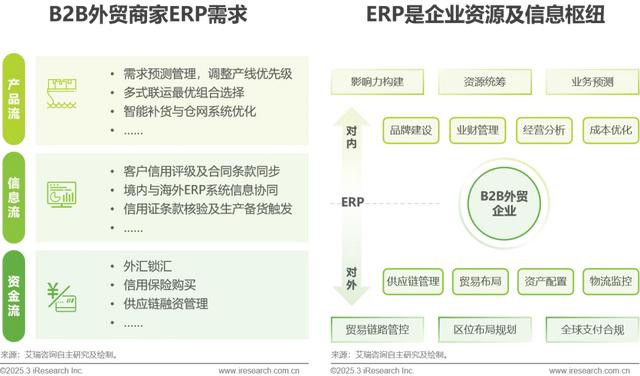 功能深入:B2B企业以大宗交易为主,多为按需生产模式,因此相对于B2C企业更重视仓储物流等下游能力,外贸B2B企业更重视生产制造等上游能力。近年,外贸B2B企业对ERP的核心需求逐渐深入至业务流、资金流、税务流的实时联动与价值挖掘,让ERP从“信息记录与调度中枢”升级为“企业经营战略指挥系统”。