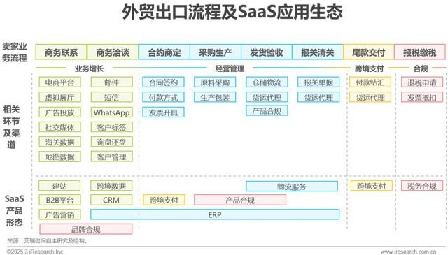 根据外贸B2B出口业务流程,可大致分为业务增长、经营管理、跨境支付和合规四大环节,针对各环节涉及的资金流、物流、品牌及客户资源、风险等,衍生了各类SaaS产品及服务: