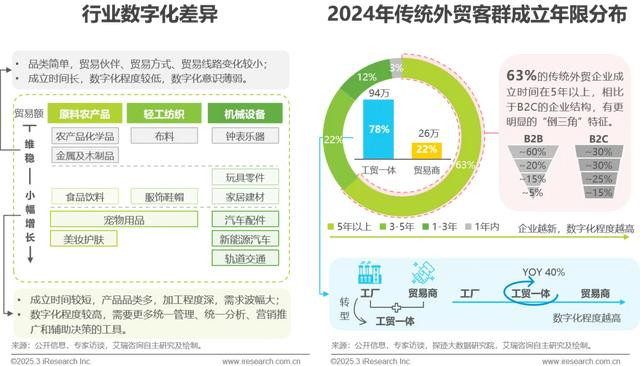 类型差异:传统外贸企业呈现越靠近产业链下游、成立时间越短,数字化程度越高的特征。通过B2B电商平台或自建站贸易的企业数字化程度相对更高。