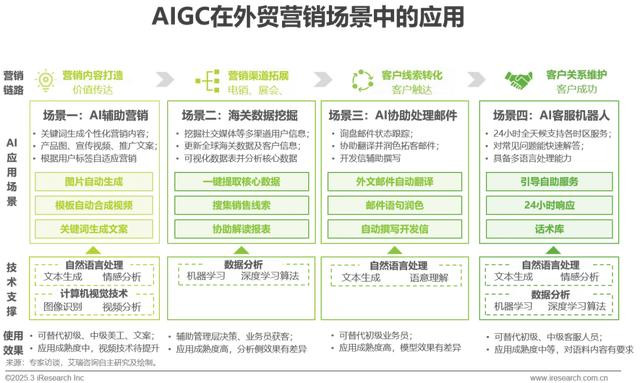 业务增长SaaS:产品及服务围绕客户转化链路、订单成交环节上下延展,产品功能相互融合。AIGC在营销环节的创意内容生成、海关数据清洗、询盘邮件润色等场景应用较为成熟。